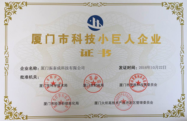 熱烈祝賀我公司廈門振泰成科技有限公司于2016年10月獲得獲得“廈門市科技小巨人”的榮譽證書,謝謝廈門市科學技術(shù)局、廈門市財政局、廈門市經(jīng)濟和信息化局、廈門火炬高新技術(shù)產(chǎn)業(yè)開發(fā)區(qū)管理委員會和廈門市發(fā)展和改革委員會對我司的高度肯定!